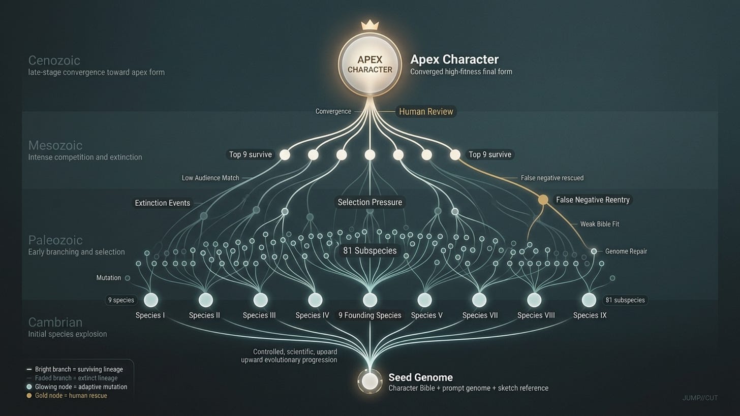 We call this process Synthetic Evolution: a closed-loop, self-referencing agentic casting methodology in which a character, or any other component in a film, is not simply designed once or even 50 times, but rather iteratively evolved through many tens of thousands of loops of generation, selection pressure, mutation, extinction, and survival until the right form emerges.